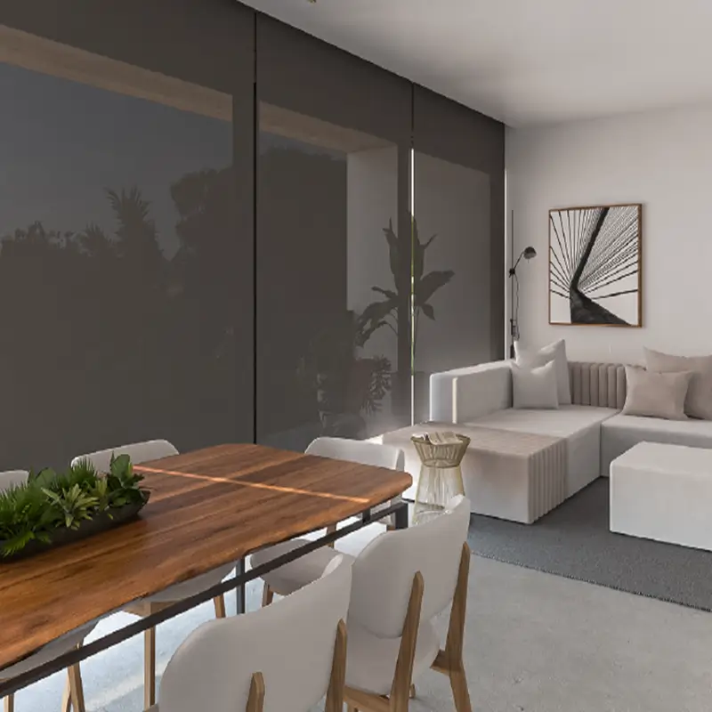 El sistema puede combinarse con roller doble screen black out para crear una solución día y noche: screen 1% para control solar durante el día y blackout para oscuridad total por la noche.